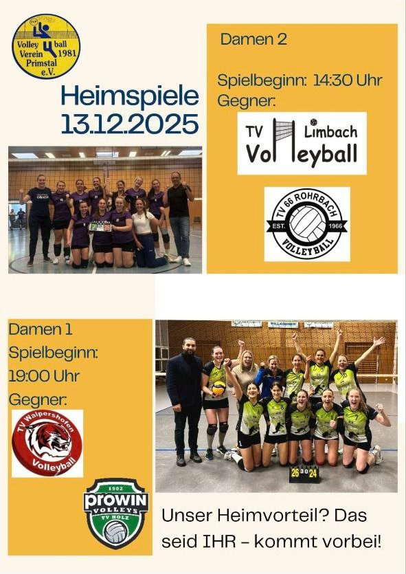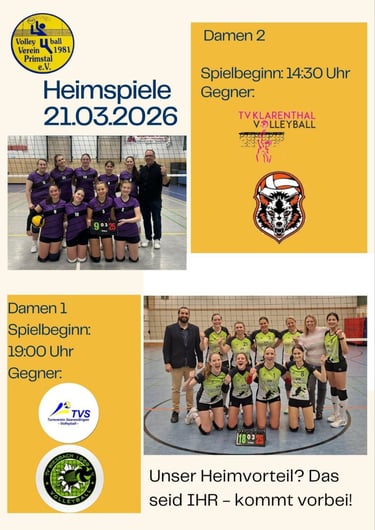 Unser nächstes Heimspiel findet am 21.03.2026 ab 14:30 Uhr mit Team 2 und ab 19:00 Uhr mit Team 1 statt. Kommt uns anfeuern! Wir zählen auf eure Unterstützung!